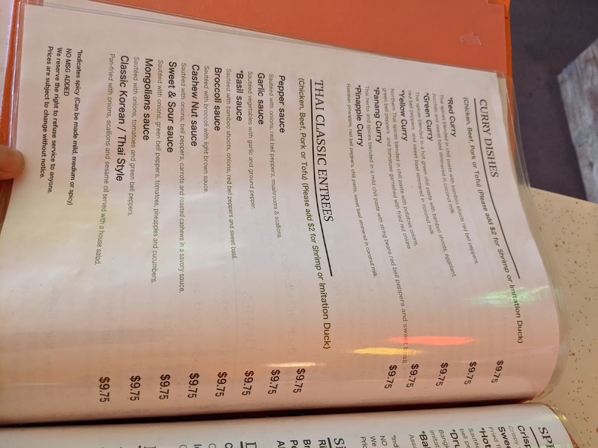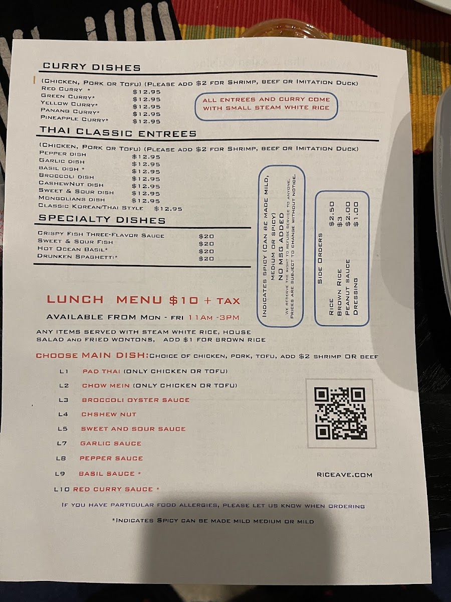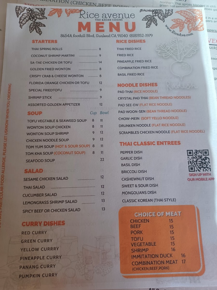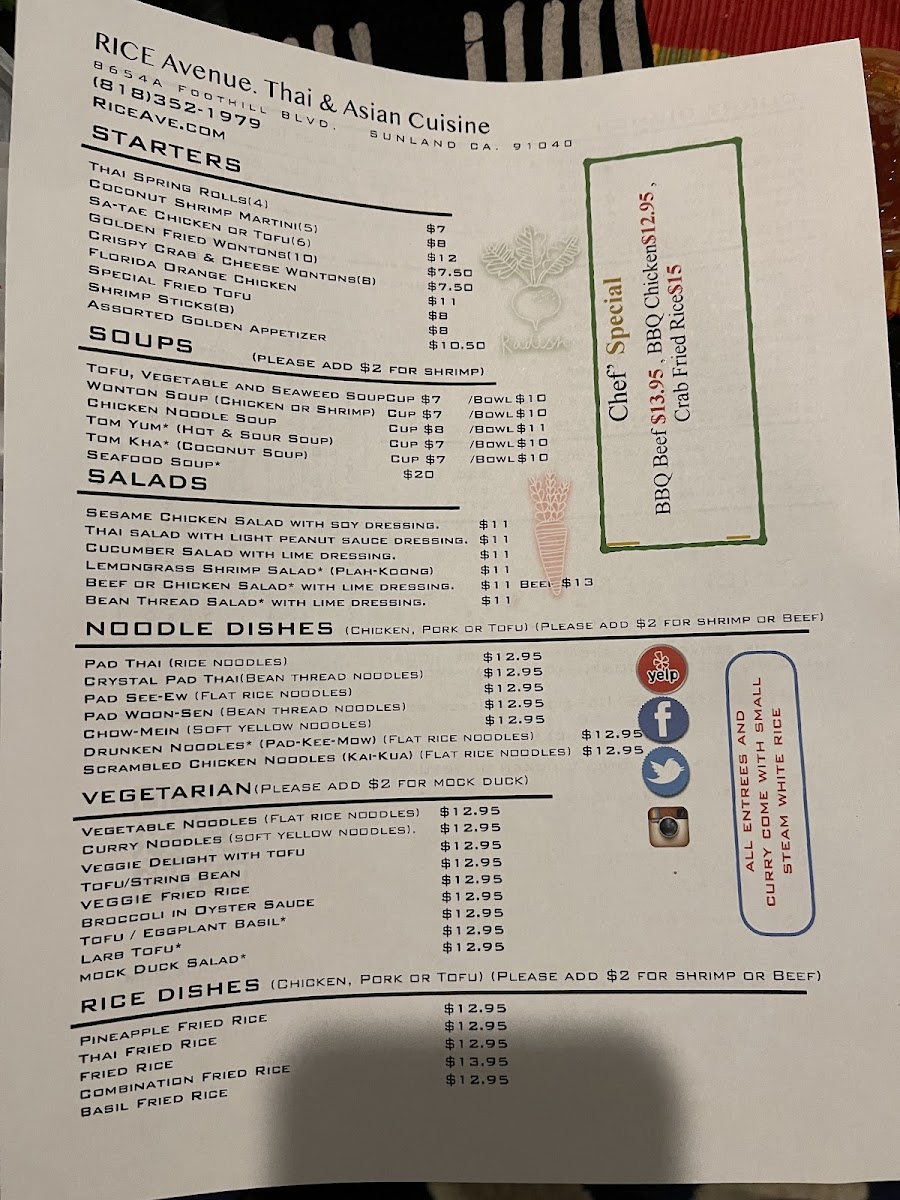 The menu at Rice Avenue Thai & Asian Kitchen offers a delightful range of dishes that highlight the flavors of Thai and Asian cuisine. For soup lovers, there’s the Seafood Tom Yum, Chicken Noodle Soup, and the creamy Seafood Tom Kha. The curry dishes are a standout, with options like the Pumpkin Curry, Panang Curry, Pineapple Curry, and the vibrant Green Curry. The Thai classic entrees, such as Pepper Sauce, Classic Korean Thai Style, and Garlic Sauce, are perfect for those seeking familiar yet exciting flavors. Noodle enthusiasts can enjoy dishes like Chow-Mein, Crystal Pad Thai, and the flavorful Pad Woon-Sen. For rice lovers, there are choices like Fried Rice, Combination Fried Rice, and the tropical Pineapple Fried Rice. The dessert menu features the indulgent Mango Sticky Rice, while the starters include crispy favorites like Crispy Crab & Cheese Wontons and Coconut Shrimp Martini. Vegetarians and vegans can enjoy dishes such as Larb Tofu, Tofu String Bean, and Pumpkin Tofu & Eggplant Basil (PTE). The salad selection includes refreshing options like the Thai Salad and Lemongrass Shrimp Salad. Specialty dishes like Hot Ocean Basil and Drunken Spaghetti add a unique twist to the menu. To complement the meal, there are refreshing beverages like Thai Ice Tea and Thai Ice Coffee. With a wide variety of options, Rice Avenue Thai & Asian Kitchen offers something for every palate.