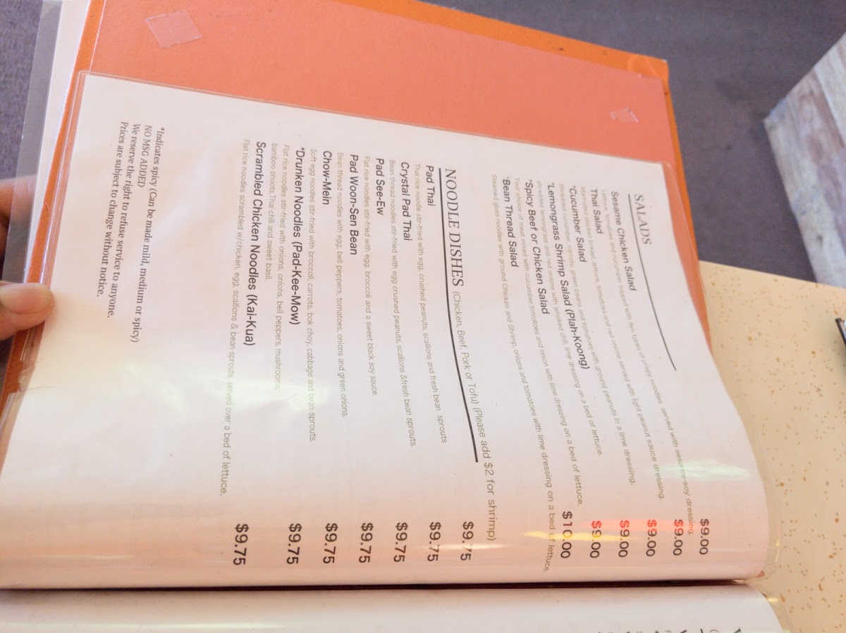 Pad-keep-mow. Flat rice noodles stir-fried with onions, bell peppers, bamboo shoots, Thai chili and sweet basil. Spicy.